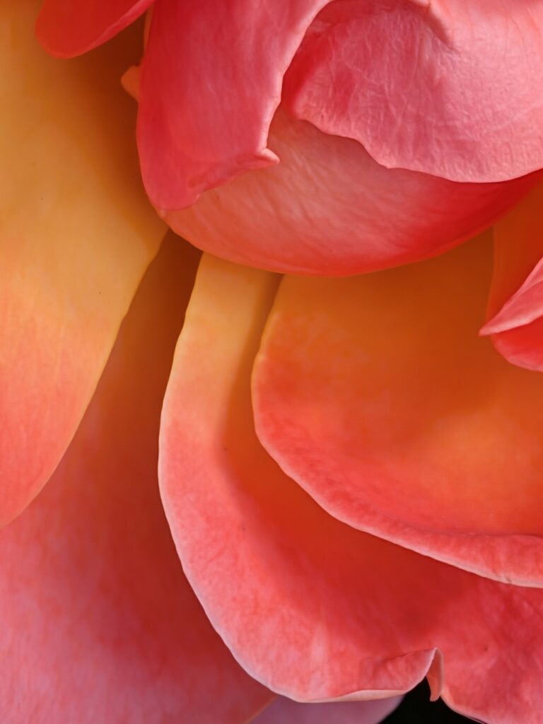 This is a close-up view of a tea rose, showing its warm yellow heart blending out to salmon-pink petals.